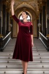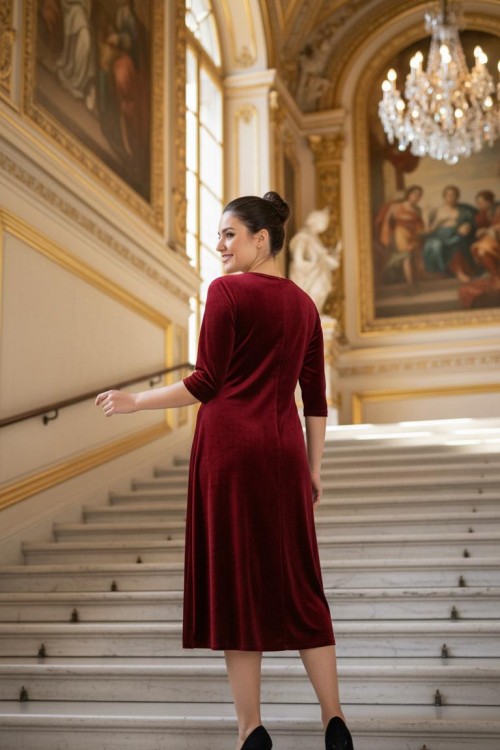 Nidya Moda Büyük Beden Kadın Bordo Çiçek Motifli Tül Kombin Kadife Abiye Elbise-4123B