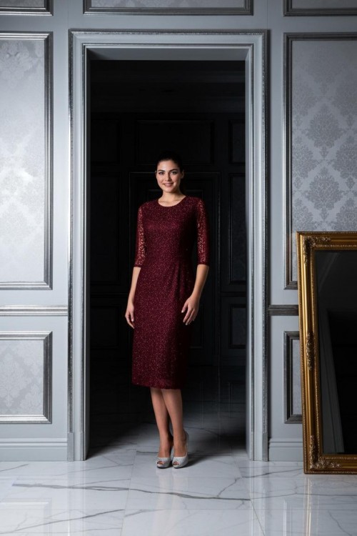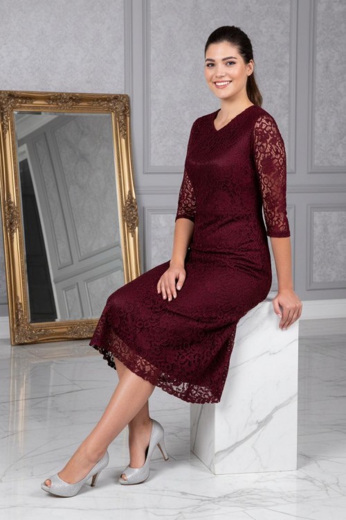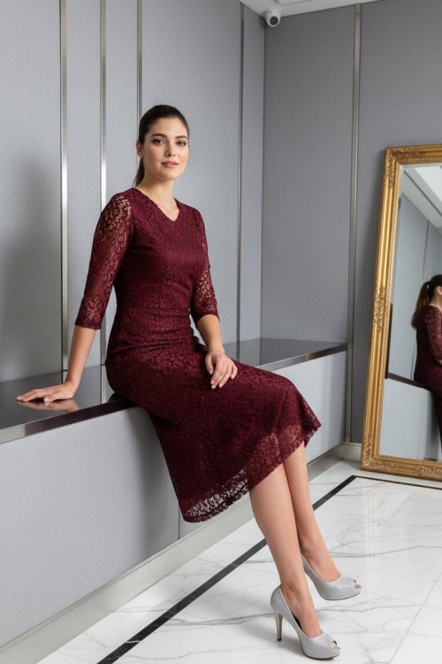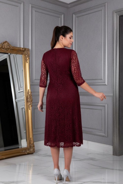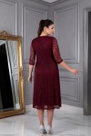 Nidya Moda Büyük beden Kadın Bordo Simli Kloş Dantel Abiye Elbise-4036YB