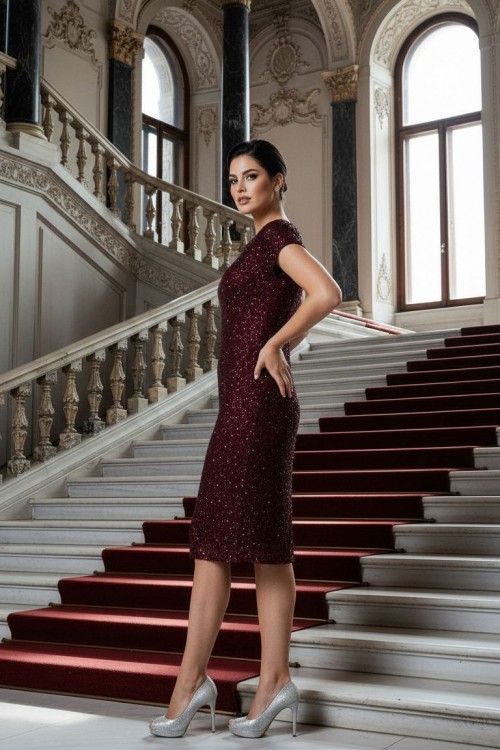 Nidya Moda Büyük Beden Kadın Bordo Vako Simli Dantel Abiye Elbise-4035YB