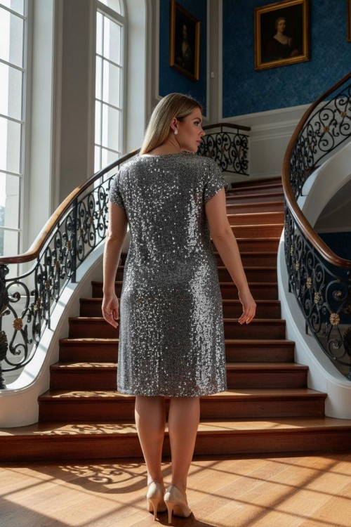 Nidya Moda Büyük Beden Kadın Gri Payet Desen V Yaka Vako Abiye Elbise-4035PG