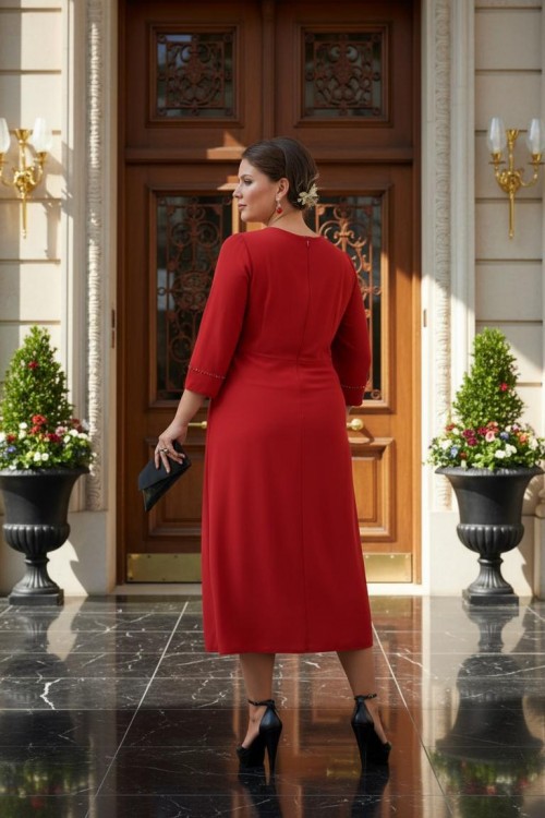 Nidya Moda Büyük Beden Kadın Kırmızı Roba Dantel Kol Taş İşli Sandy Abiye Elbise-4025AK