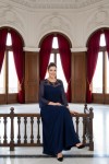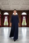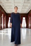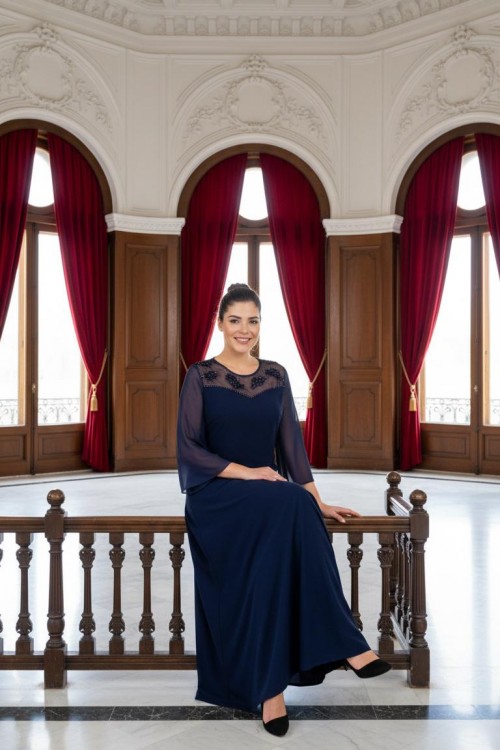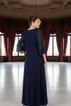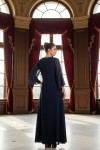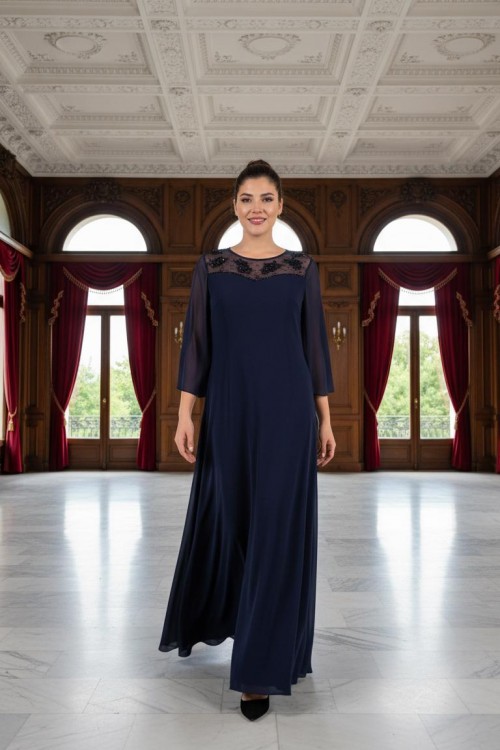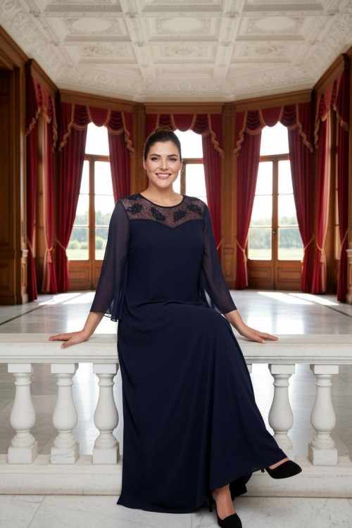 Nidya Moda Büyük Beden Kadın Lacivert Şifon Kol Roba Tül Taşlı Motifli Uzun Sandy Abiye Elbise-4115L