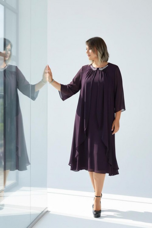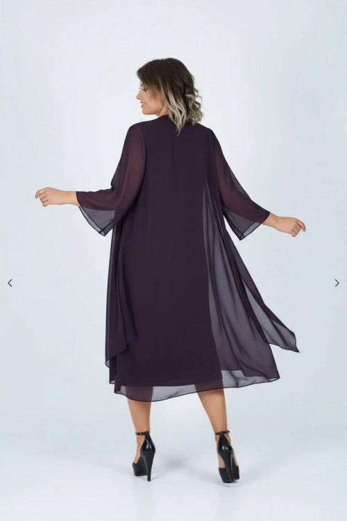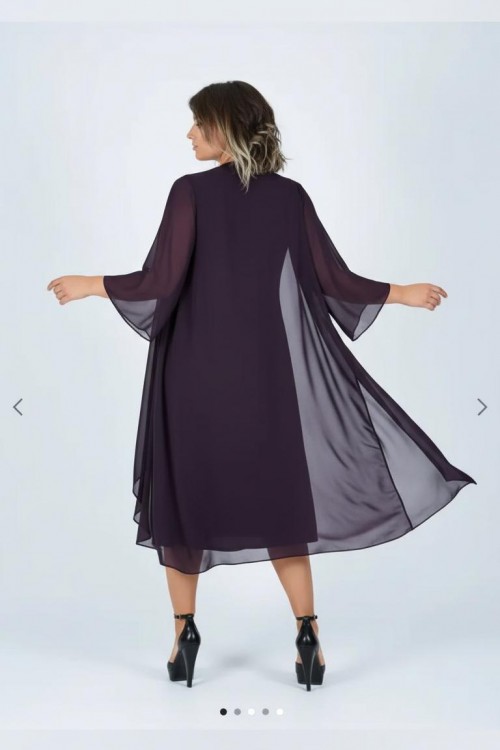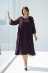Nidya Moda Büyük Beden Kadın Mürdüm Taşlı Yaka Üstü Şifon Sandy Abiye Elbise-4037M