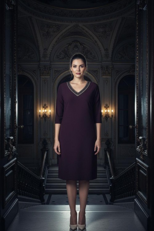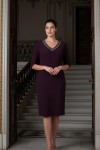 Nidya Moda Büyük Beden Kadın Mürdüm V Yaka Taşlı Sandy Abiye Elbise-4039M