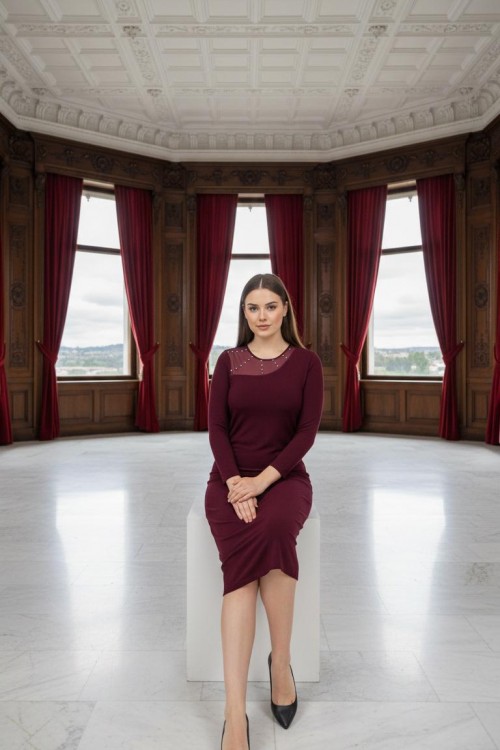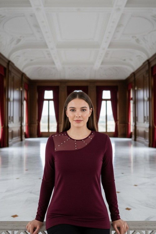 Nidya Moda Büyük Beden Kadın Mürdüm Roba Tül Taş İşli Sandy Abiye Elbise-4089M