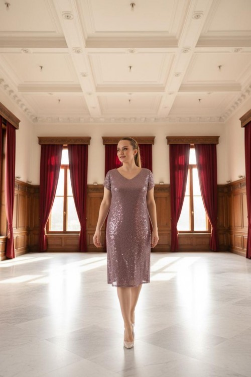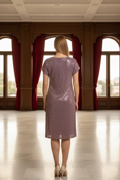 Nidya Moda Büyük Beden Kadın Oranj Payet Desen V Yaka Vako Abiye Elbise-4035PO