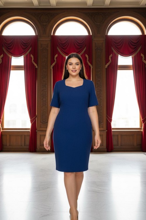 Nidya Moda Büyük Beden Kadın Saks Prizma Yaka Abiye Elbise-4165SX