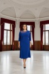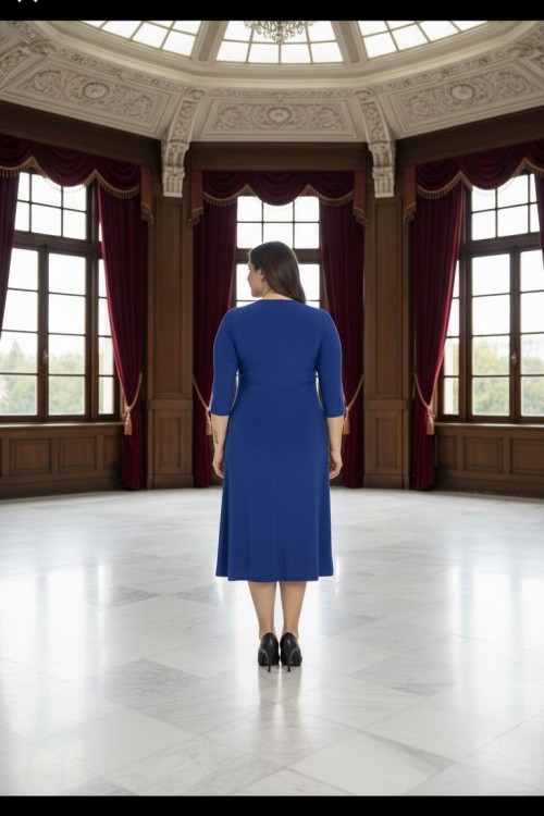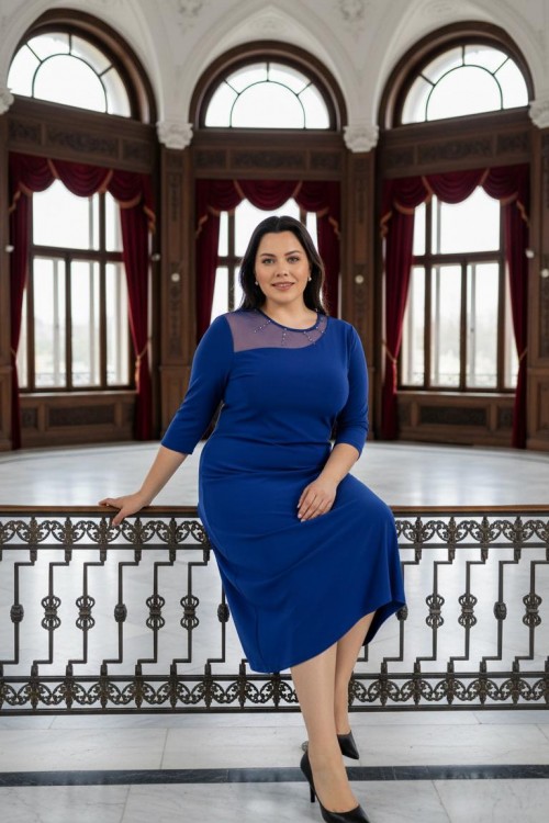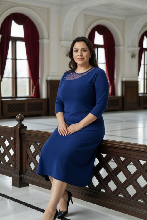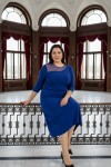 Nidya Moda Büyük Beden Kadın Saks Roba Tül Taşlı Sandy Abiye Elbise-4089SX