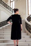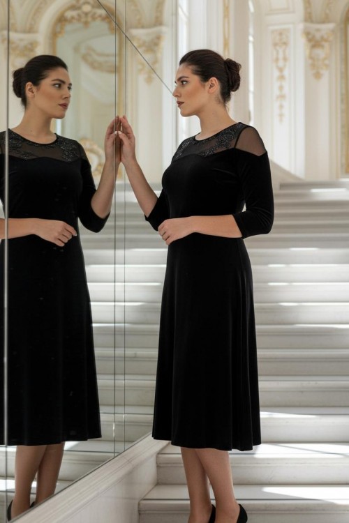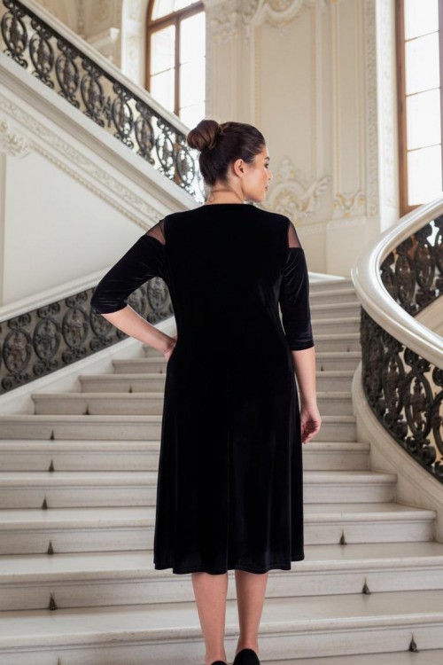 Nidya Moda Büyük Beden Kadın Siyah Çiçek Motifli Tül Kombin Kadife Abiye Elbise-4123S