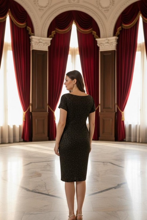 Model Ölçüleri:44 Beden Boy:179 Göğüs:104-108 Bel: 88-92 Basen 108-112 cm Elbise Boyu:107 cm