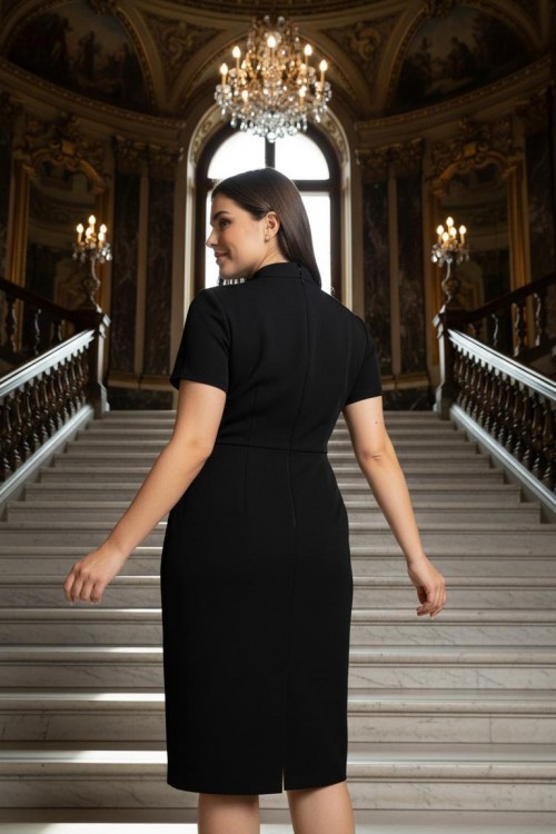 Nidya Moda Büyük Beden Kadın Siyah Kruvaze Yaka Krep Abiye Elbise-4098S