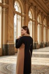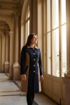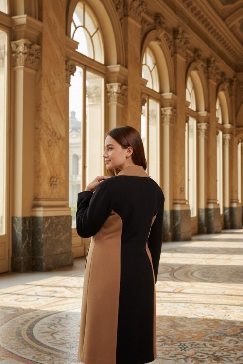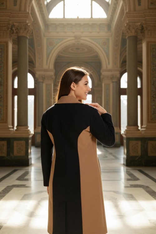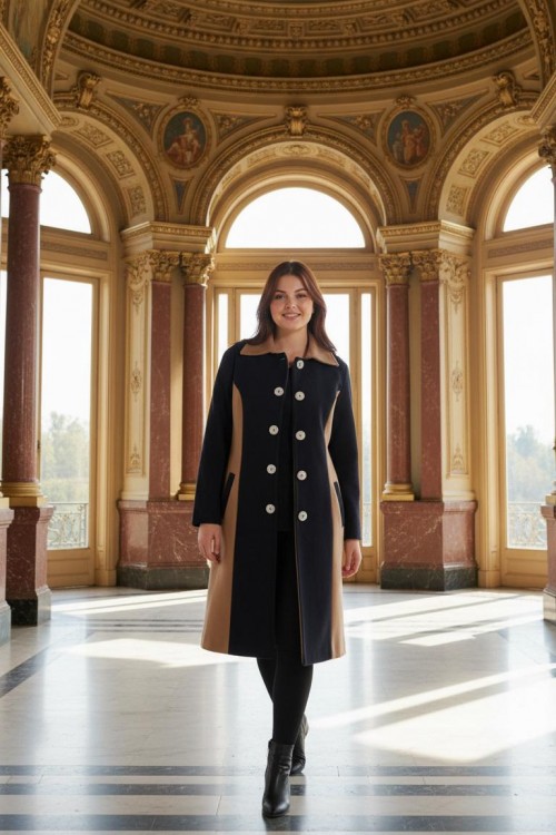 Nidya Moda Büyük Beden Kadın Siyah Kupları Taba Kombinli Uzun Kaban-5012SK