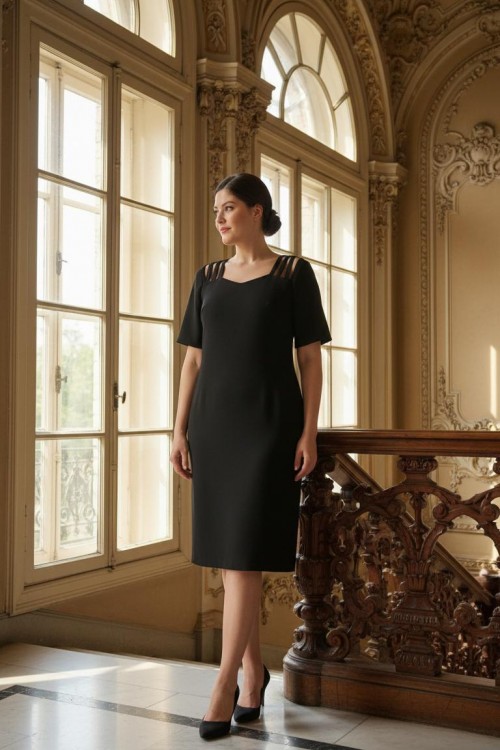 Nidya Moda Büyük Beden Kadın Siyah Omuz Şeritli Krep Abiye Elbise-4155S