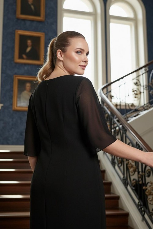 Nidya Moda Büyük Beden kadın Siyah Şifon Kol Omuz Dantel Taşlı Krep Abiye Elbise-4066S