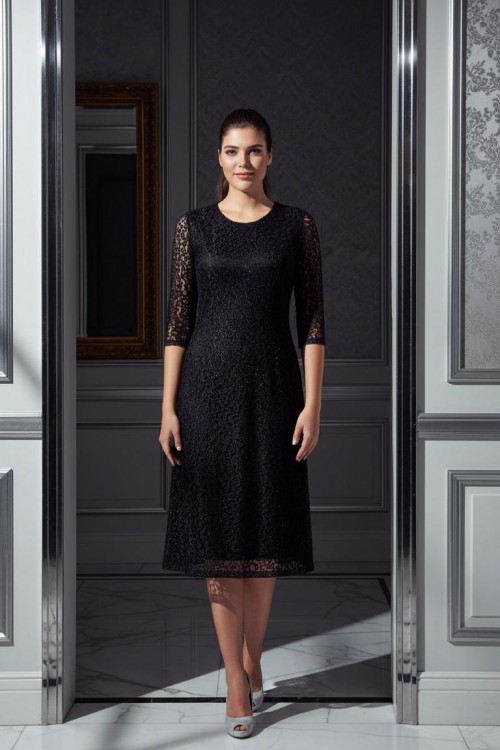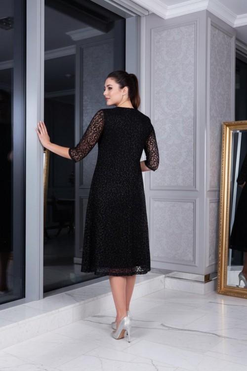 Nidya Moda Büyük Beden Kadın Siyah Simli Kloş Dantel Abiye Elbise-4036YS