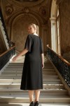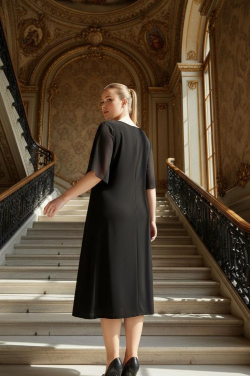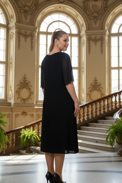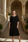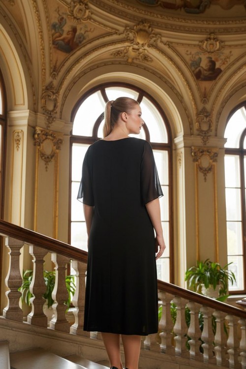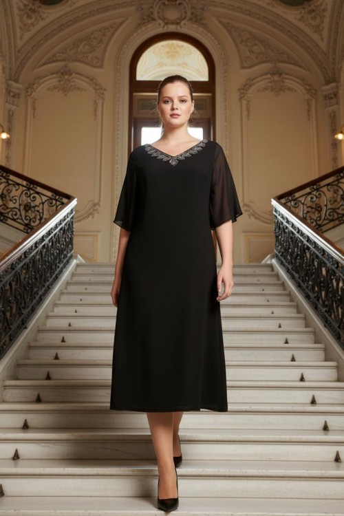 Nidya Moda Büyük Beden Kadın Siyah V TaşlıYaka Şifon Kol Sandy Abiye Elbise-4053S