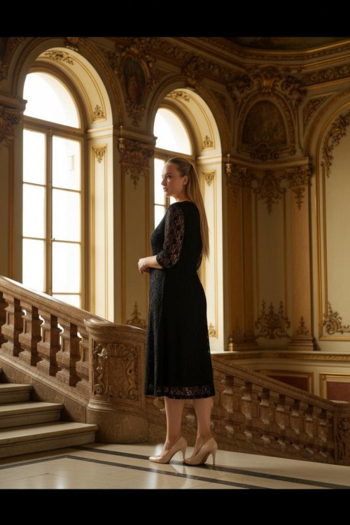 Nidya Moda Büyük Beden Kadın Siyah Yarım Kol Dantel Abiye Elbise-4009DS