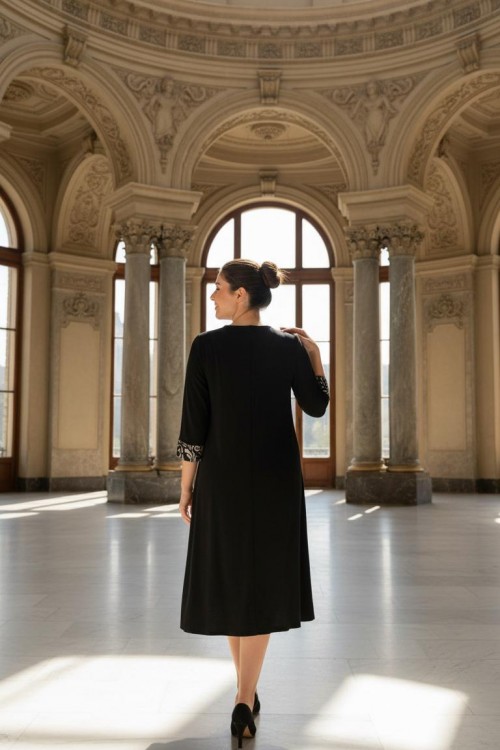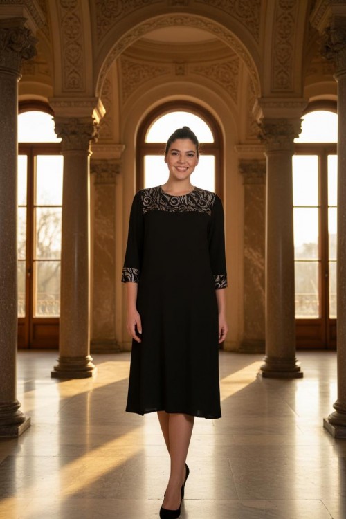 Nidya Moda Büyük Beden Kadın Siyah Roba Brokar Dantel Kombinli Sandy Abiye Elbise 4143S