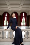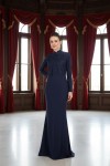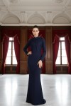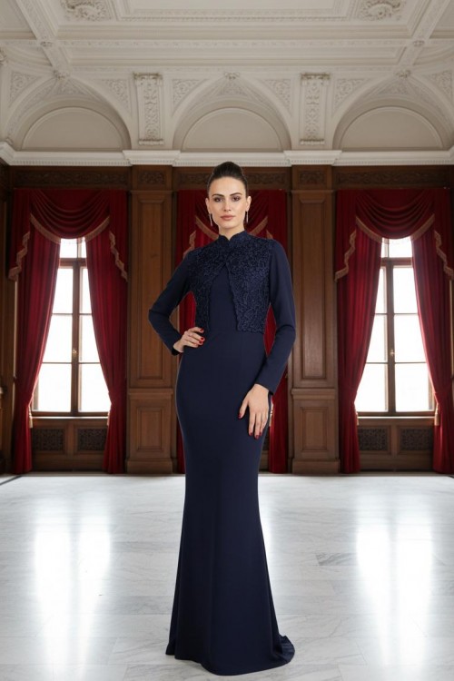 Nidya Moda Büyük Beden Tesettür Kadın Lacivert Dantel Kombin Balık Krep Uzun Abiye Elbise-4154L
