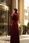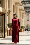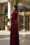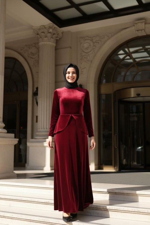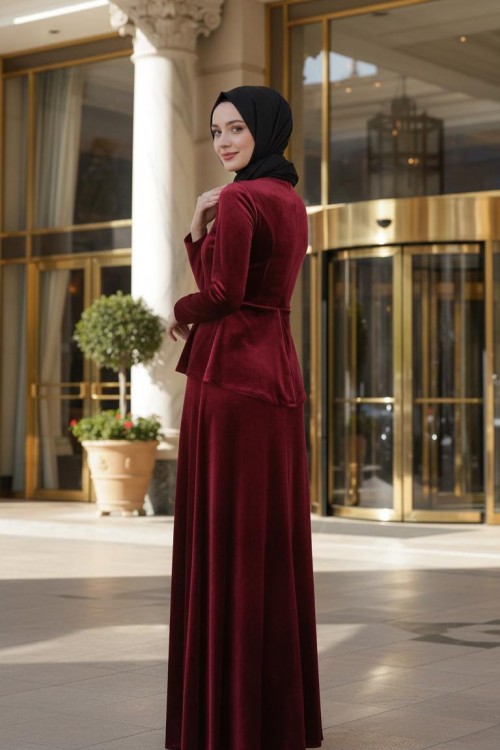Nidya Moda Tesettür Kadın Bordo Peplumlu Kadife Abiye Elbise-4044TB