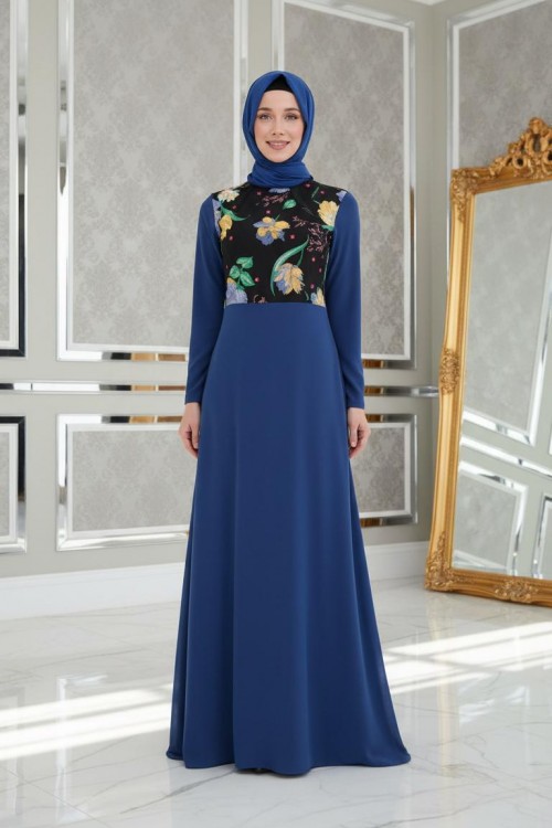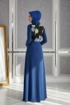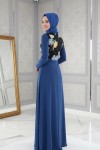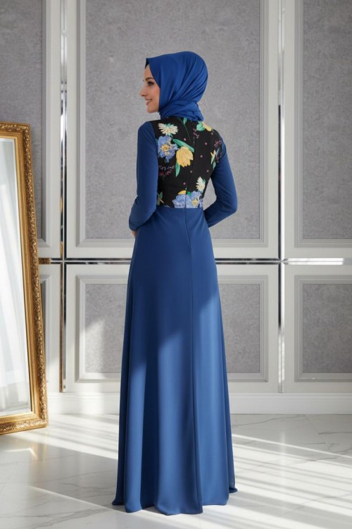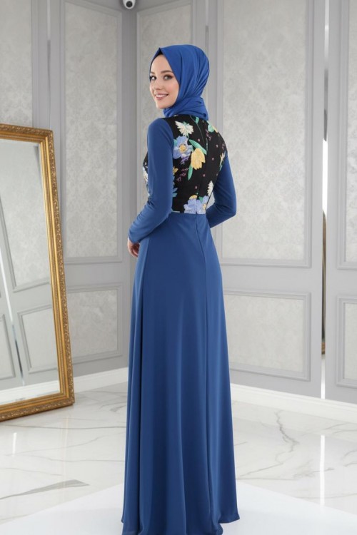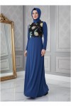 Nidya Moda Tesettür Kadın Saks Üst Çiçekli Sandy Abiye Elbise-4046TSX