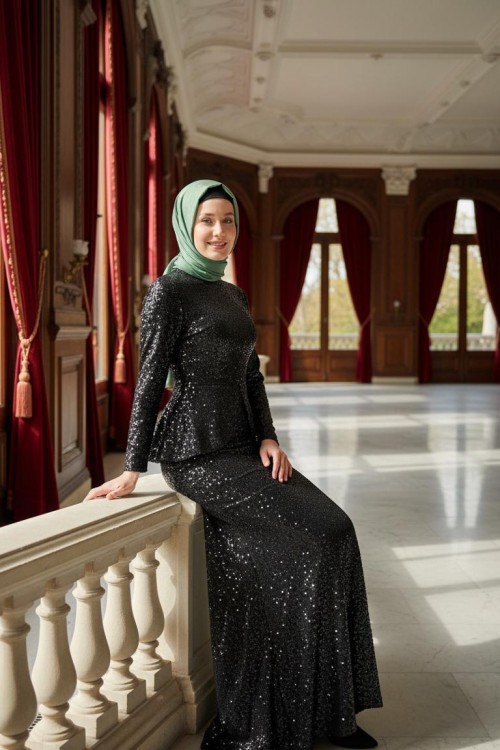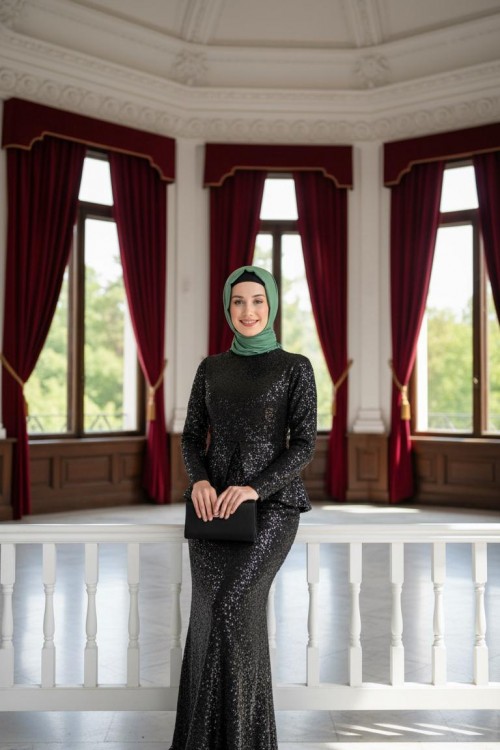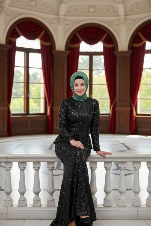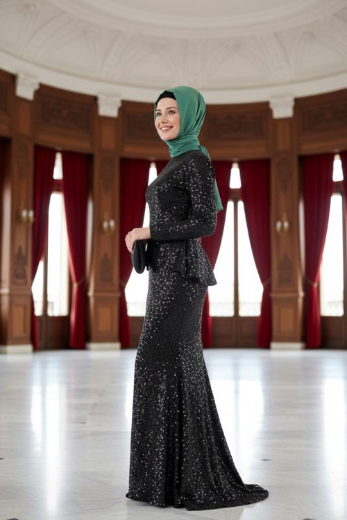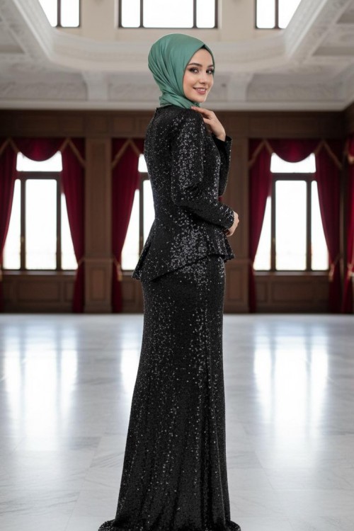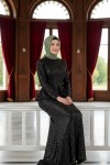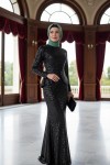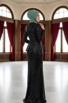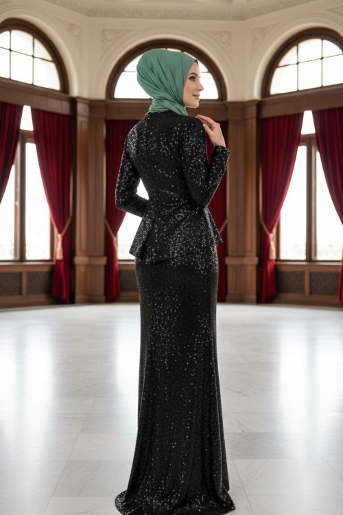 Nidya Moda Tesettür Kadın Siyah Peplumlu Pullu Payet Balık Abiye Elbise-4047TS