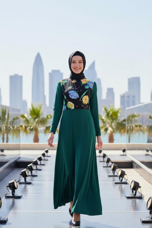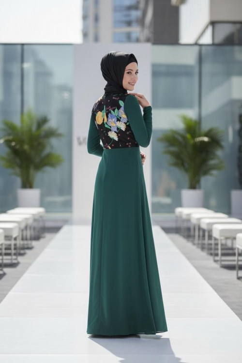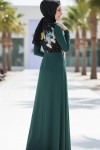 Nidya Moda Tesettür Kadın Yeşil Üst Çiçekli Sandy Abiye Elbise-4046TY